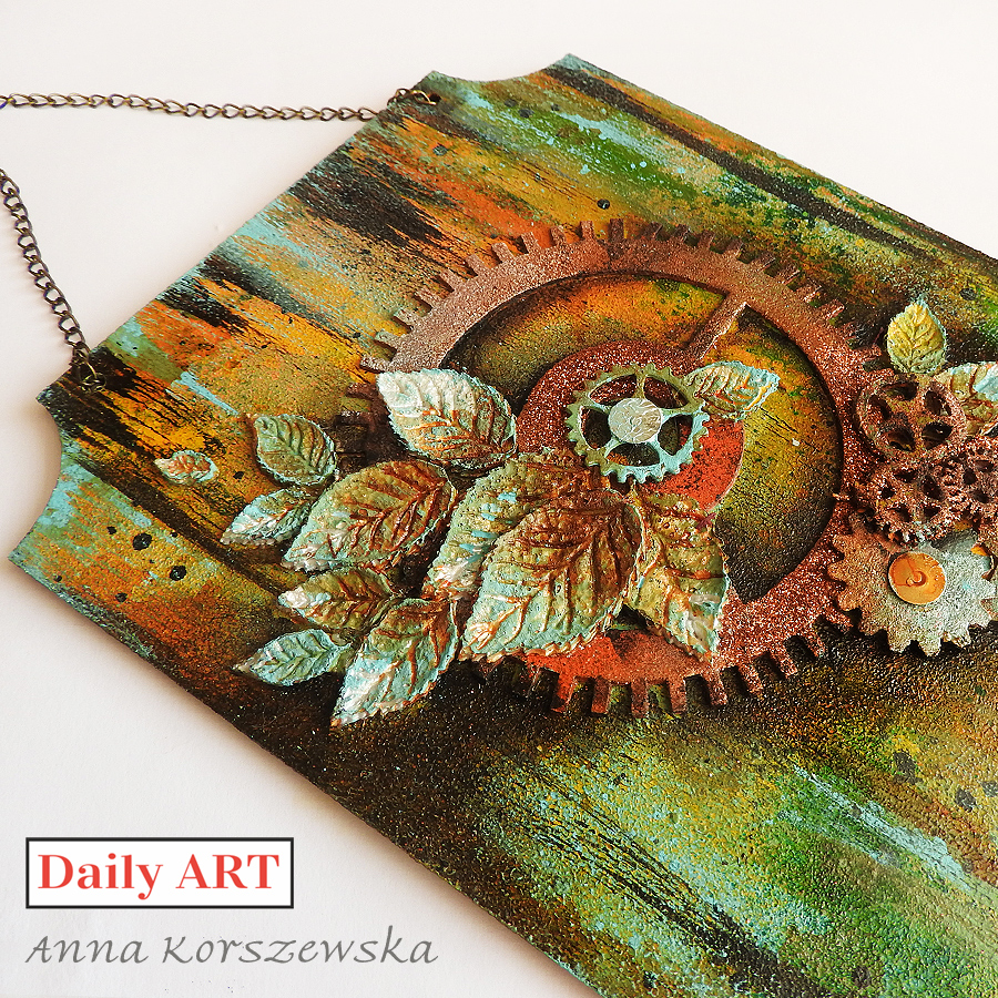 - podkład czarny, folia i klej do złoceń Pentart, heavy body gel Pentart, Proszek Mineralny Jasper Pentart, kwiaty papierowe, bitum, taca, farby kredowe Pentart